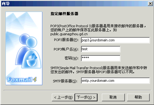 4¡f ¥Ñ©ó¨Ï¥Îfoxmail³nÅé¨Ó¶i¦æ¶l¥óªº¦¬µo¡M©Ò¥H´Nn¹ï¦¹³nÅé¶i¦æ¦¬µo¶l¥ó¦øªA¾¹ªº³]©w¡Mpop3¬°±µ¨ü¶l¥ó¥Îªº¦øªA¾¹¡M¦ppop.yourdomain.com¡M¥Î¤á¦W¬°¥Î¤á¦byourdomain.comùر¥Ó½Ð¨ìªº±b¸¹¡M±K½X¬°µn³°¨ìyourdomain.com¶l½c®É¨Ï¥Îªº±K½X¡MSMTP¬O¥Î©óµo°e¶l¥ó®ÉÔn¨Ï¥Îªº¦øªA¾¹ªº¼Ðñ¡M¦p¡Msmtp.yourdomain.com¡M¦p¤U¹Ï©Ò¥Ü¡C¡]yourdomain.comªºSMTP¦øªA¾¹¡Rsmtp.yourdomain.com¡MPOP3¦øªA¾¹¡Rpop.yourdomain.com ©ÎªÌyourdomain.com¡^ÂIÀ»¤U¤@¨B