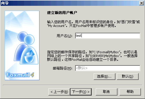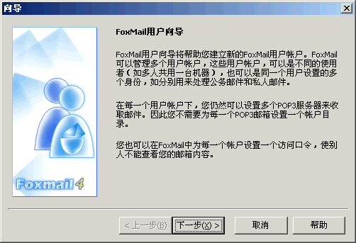 2〕 Foxmail为便于多用户邮箱管理,每个用户都要为自己的帐号设定一个标示用户名,用于识别每一个用户的使用,如下图所示,点击下一步