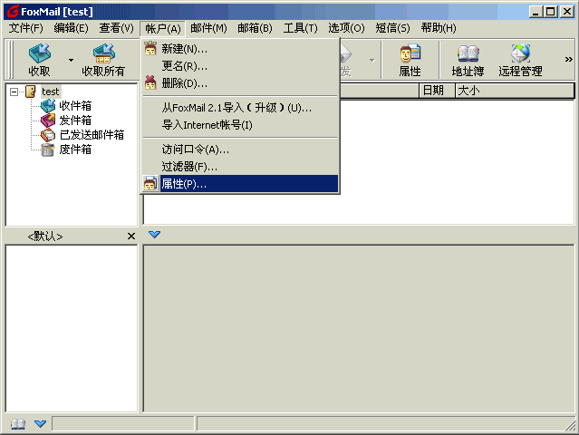 6〕 若以后要对此帐号设置进行修改,也可以点击“帐户”菜单,选择“属性”。如下图所示: