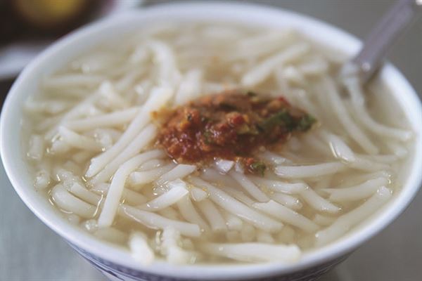 米粉湯所用的米粉是北部習慣的粗體米粉,不過米粉伯並沒有使用油蔥酥或芹菜珠來提味,當然,這也就表示米粉伯對自家熬煮湯頭的自信。因此,無論你是來上一碗原味的米粉湯,或是加上一匙同樣是自家特調的辣椒醬,都能夠嚐到米粉伯精心製作的平價好滋味。