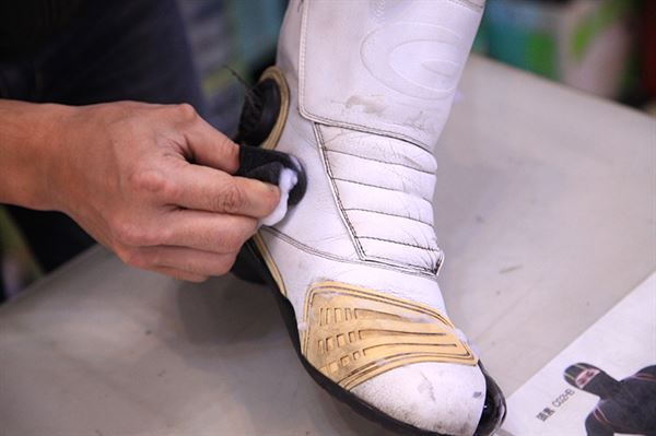 一般來說車靴有皮革的部分也有塑膠的區塊,有些較頂級款式的車靴在鞋頭的部分還有一層金屬滑塊。在清洗的時候建議先將鞋頭滑塊連同兩顆金屬螺絲一併拆下,之後一樣可以在皮革的部分使用皮革去汙清潔劑,塑膠的部分可用毛巾沾肥皂水擦拭,陰乾之後擦上皮革保養油就可以了。
