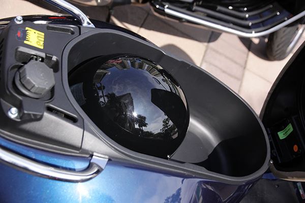 GTS300 NEW的四種車型都導入了ABS以及ASR系統,將科技與復古時尚做了一次完美的揉合。ASR系統為加速防滑系統,當感應到後輪輪速與前輪增加幅度相差過大時,系統會自動介入延遲點火,使輪胎迅速回復抓地力;ABS系統近年幾乎成為重車的標配,Vespa也從善如流的跟進。插著鑰匙將中控鎖向內一推,手套箱緩緩降下,阻尼感十足;車充、維修工具包等等應有盡有。打開坐墊可以見到專屬的椅墊護套,就像是隨車的車罩一樣,不論是何種惡劣氣候,只要停好車將護套套上,椅墊就能得到最完善的保護;寬大且深邃的車廂則可以放下兩頂原廠的安全帽。由電鍍邊框所環抱的是簡約設計的儀表板,按下Mode鍵則可切換時速、單趟里程、累積里程、油量等等,不會因為滿滿的資訊一次顯示在儀表版上而顯得雜亂。這些還不夠?GTS300還能與智慧型手機進行多媒體平台的連結,透過這款叫做Vespa Multimedia Platform(VMP)的APP可以觀看頃角、平均油耗、最高速度以及平均速度甚至監看胎壓、使用衛星導航、自動偵測車體異常等進階功能都一應俱全,甚至有自動搜尋附近停車場、加油站、服務中心,車主旅遊的需求也能得到充分的滿足!這套APP已經在Ios系統以及Andriod系統上架。