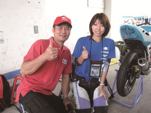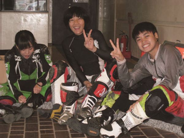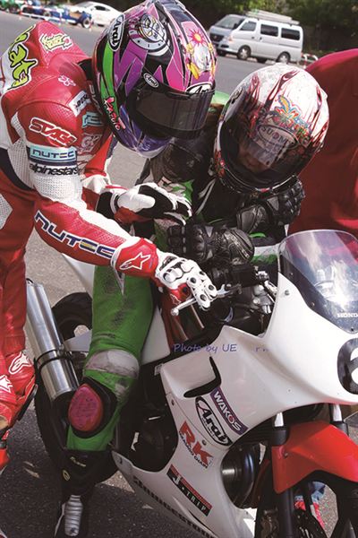 在經過基本動作的重點教學之後,自然就要讓各位選手下場試車,由MFJ賽會提供的統一規格Honda CBR150擔任選手們的比賽車,不過由於車輛不能做任何的調整,兩位選手在激烈練習時,都不幸轉倒,劉君眉選手甚至發生嚴重HighSide,所幸並無大礙,不過坂田教練也藉此機會給兩位選手機會教育,讓車手更加的了解為什麼會轉倒。結束了全天的練習之後,教練還幫所有選手做課後輔導,以賽道地圖進行詳細的解說,讓榮哥大嘆:『果然是世界冠軍,連放屁都是香的』。這次的練習讓兩位選手在賽道技巧上進步許多,更知道了以往賽道騎乘中從沒有體會過的技巧,期待兩位女選手的實力能更上層樓。