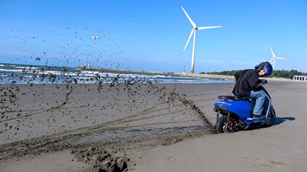 玩心大開的安倍優也在沙灘上玩起後輪噴砂的歡樂秀,利用後輪原地大扭力高速旋轉將地面的沙土向後噴出,拉出一幕幕的沙幕