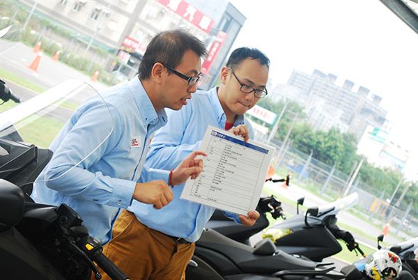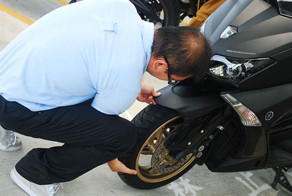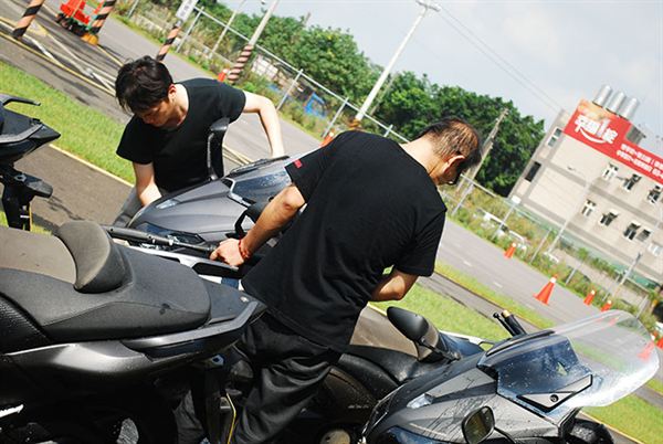 第二大類別就是「實際的安全駕駛教學」,首先是靜態的騎乘姿勢要求,對於騎乘姿勢加藤教練提出了許多對錯的姿勢對比,讓學員們可以完全理解這些動作的差異,還有這些動作到底會產生什麼影響。由於TMAX是屬於長程的巡航車種,因此在行前安全的檢查就一定不能馬虎,畢竟時速很容易上到破百,這時候胎壓、胎紋、機油等小細節都容易影響安全。在靜態的教學結束後,就開始了實際的演練課程,在這裡可以看到一個日本人有多麼講究,在學員們下場騎乘時,為了讓大家肌肉都能保持輕鬆有餘的狀態,因此帶著所有學員先做了暖身操,讓身體保持一定的血液循環後,才放學員們下場實習。