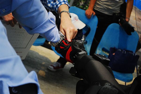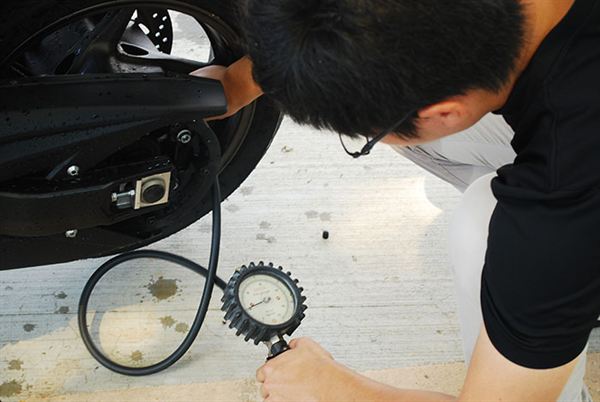 工作人員仔細檢查每一輛車的胎壓是否充足