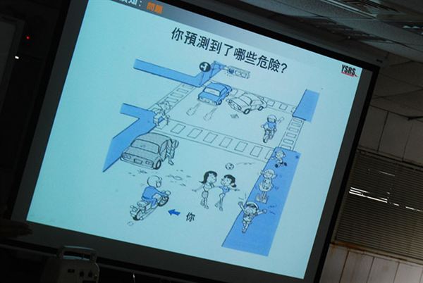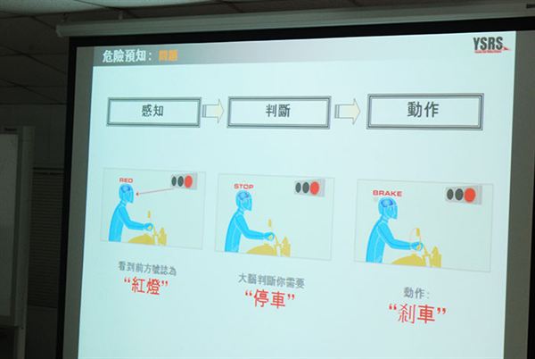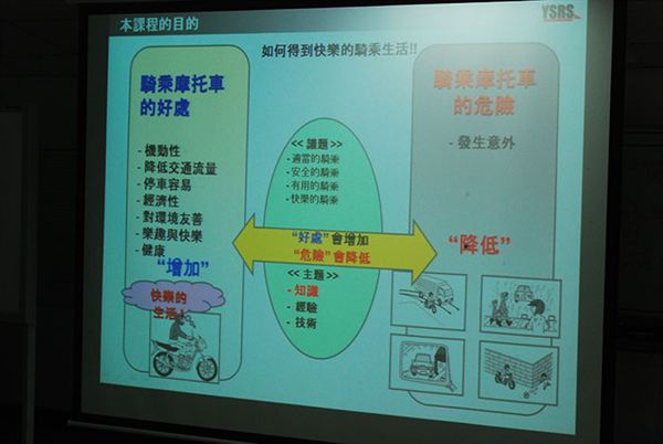 課程主要分成兩大類別,第一項就是「安全教育說明會」,這一部分是由王政雄先生所負責。這一塊可以說是相當基礎但卻又相當重要的觀念課程,其中講到摩托車的機動性、降低交通流量等多項優點,也有說到關於摩托車騎士意外受傷的機率等要點,徹底的解說了該如何盡情享受摩托車生活的幾項重點。其中最重要的就是危險預知,在道路騎乘上,摩托車總是比汽車多了許多潛在的危險,該如何預測意外事故的來臨,倘若遇到意外的瞬間,我們該怎麼去反應,身體的神經反應是否跟得上,這些都是相當的課題,也是需要長時間去鍛鍊。
