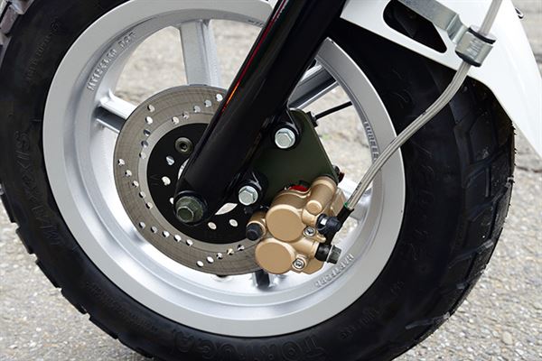 Mini 125採用前碟後鼓的配置,碟煞亦是使用單二活塞卡鉗,同時搭配金屬油管,可以達到一定的制動性能。