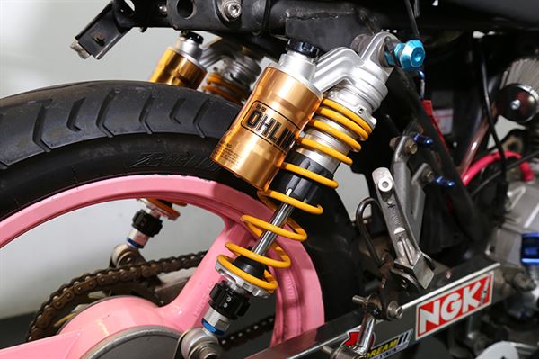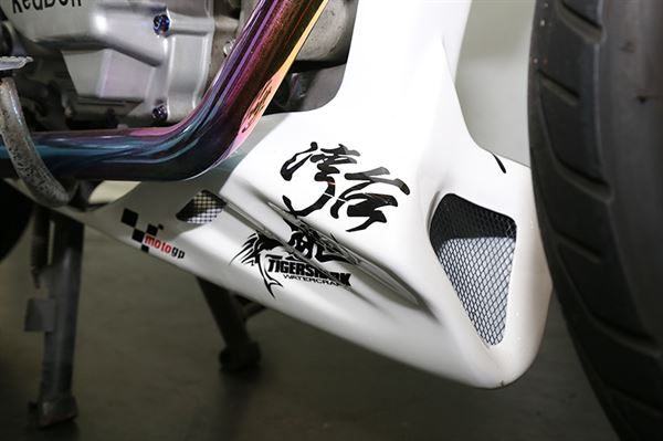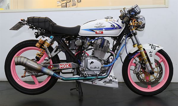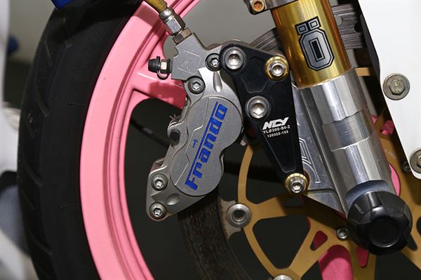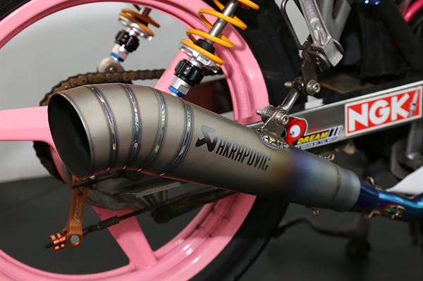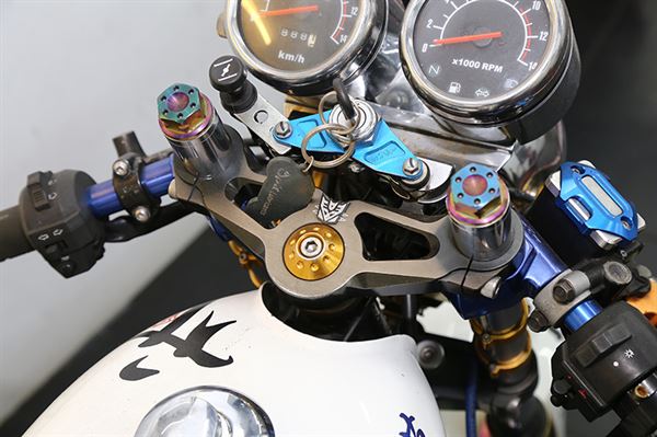 野狼除了是見證台灣經濟起飛的經典車輛以外,也是許多騎士們精心改造的熱門車種之一,這一台「彩鈦武魂白狼」以整車最亮眼的彩鈦前段蠍子管和粉色烤漆的前後輪框創造出了衝突的美感,禾倉簍空三角台不但增加車體行走的穩定度以外,對騎士視野也有相當不錯的加分效果,CODO 66 4V汽缸套件的強大性能大大增加了動力以外,四汽門的設定讓高轉延伸性大幅增加,加大的浮動碟盤與FRANDO對四卡鉗大大增加煞車性能以對應動力大幅提升的CODO 66 4V汽缸套件。