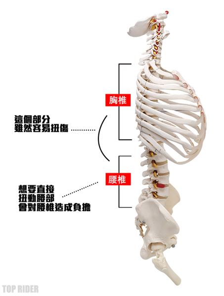 讓上半身旋轉的主要部位是胸椎,但是只扭動上半身的話力量不容易傳達到車身,也是增加背部、腰部的負擔,導致疼痛的主因