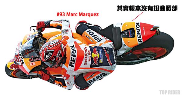 MotoGP年度冠軍的Marc Marquez用著豪爽的騎乘姿勢開啟磨肘過彎的全新時代,觀察他的姿勢,其實也沒有扭動腰部
