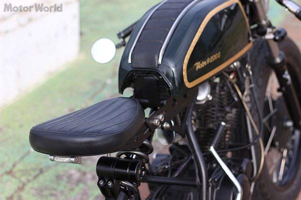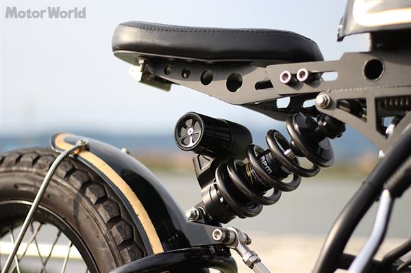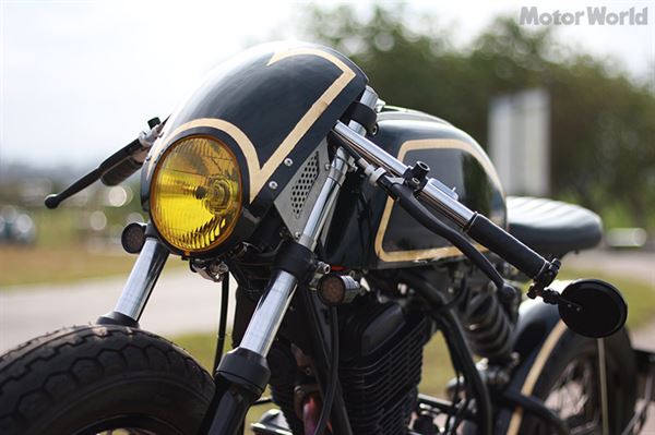 這台N/6-Gold前端使用手工支架來固定馬克頭燈,讓頭燈罩顯得更出眾極致,SR400的三角台搭配手工打造的分離把、隱藏式油門以及快速開關,讓整台車頭看上去乾淨俐落,油箱部分選用CB125K油箱,加強手工車整體流線性,在尾端設計上,老闆打造了可調坐墊,藉由卡榫前後調整可以帶來騎乘時的舒適性,捨去原有的雙槍避震,改成RPM中置避震器搭配上Kick圓管搖臂,再以手工打造U環來連結搖臂與避震鎖點,就連後土除都是自己手工,可以看到老闆用心來完成別人的夢想。