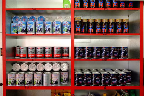 油品架上依照價格及機油種類加以分類,而且清一色都是光陽機車所指定的油品。
