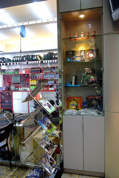 在玻璃櫥窗的機車精品以及DV架的陳列,其擺設都相當別緻。