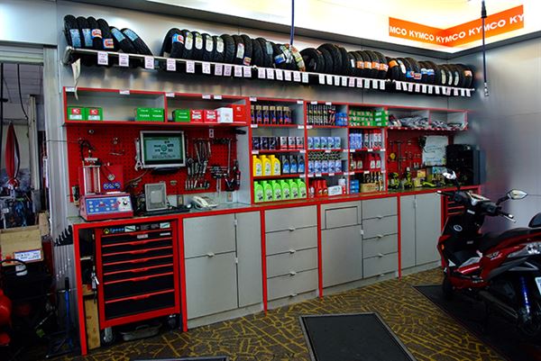 乾淨整潔的維修區,其工具及機油、輪胎等耗材,均排列相當整齊,可說相當專業。