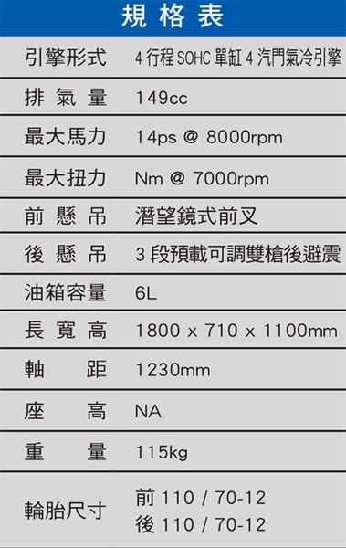 採用更當家招牌G6相同的150CC單缸4汽門氣冷引擎,並升級為前後碟煞。雖然並沒有定位成運動取向,但是性能表現還是讓我們非常期待。