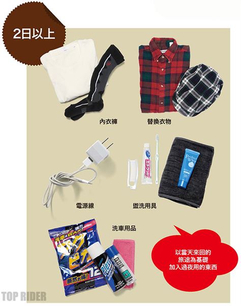內衣褲的替換一定是必須的行李,如果留住在旅館或是HOTEL等地方的話就能減少牙刷或是毛巾,電子產品的充電器和停車後觀光用的衣物也別忘了