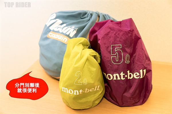在外頭過夜或是露營的騎乘旅遊會有許多行李,如果全部塞在同一個空間的話容易在路上找不到想要的東西,再加上如果把內衣、牙膏、工具、洗車劑等東西全部混在一起的話,一旦漏液的話就沒有衣物可以替換了,將行李放進包包裡的時候可以依照內衣褲、盥洗用具、工具等類別分別放進小袋子裡,液體類則利用裝入可以密封的袋子內