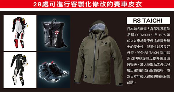 賽車皮衣有分為公版及量身訂做兩種選擇,前者是為了販售大量製造的固定尺寸成衣,是經過調查符合大多數人尺寸的設定,價格比起量身訂做便宜許多,但同時也需要接受公版皮衣部分細節不合身的問題;量身訂做雖然是經過專業測量,可以完全符合騎士個人尺寸,但除了造價昂貴外,也需要消耗時間製作。但RS TAICHI這次推廣的服務就是以公版皮衣上推出可以修改28處尺寸的特殊設計,只要經過測量就可在公版皮衣進行微調修改,不但可以讓騎士在不用特別訂製的前提下擁有相當合身的皮衣以外,時間與費用也大幅降低。