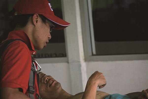 因賽事意外而受傷的管鵬翔,由領隊岳庭的陪同下,在賽場的診療室進行檢查。