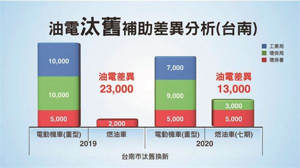 在台南市的汰舊換新補助上,2019年和2020年電動車與