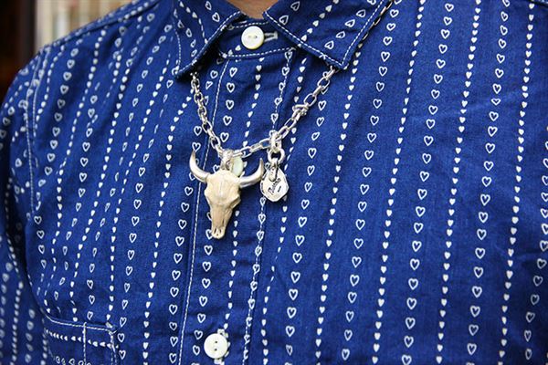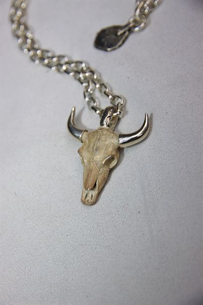 925純銀製成的項鍊,在牛骨造型的部份以白漆妝點,營造出白色頭骨的氛圍,經一段時間使用後會慢慢透出純銀的閃亮質地。