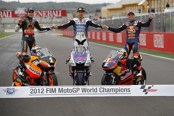 Lorenzo則是以第二名完賽,在本站封王,睽違一年之後再度成為2012年MotoGP的冠軍車手,Lorenzo本年度除了在荷蘭站因被Bautista拖累而沒有成績以外,其他每一站不是第一就是第二,以穩定的積分累積拿下2012 MotoGP冠軍寶座,這樣的成績讓大家沒有話說。Lorenzo的冠軍寶座實至名歸,明年車迷們將能再看到車號1號的M1,Lorenzo也將與老隊友Rossi展開激烈競爭。