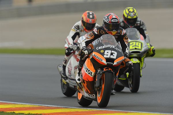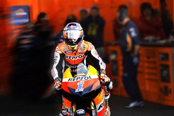 MotoGP來到最終站瓦倫西亞站,3個等級的年度冠軍都已經出爐,不過比賽依然相當精采,MotoGP比賽前都是溼地賽,車手們紛紛裝上雨胎應戰,但等到MotoGP比賽時已經沒有下雨,地面也是半乾狀態,冠軍Lorenzo大膽地選用光頭胎上場,Pedrosa則是選用雨胎,不過在跑完暖胎圈後,Pedrosa也大膽放棄竿位起跑的優勢,回去Pit區換光頭胎,從Pit區起跑。