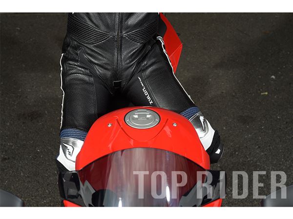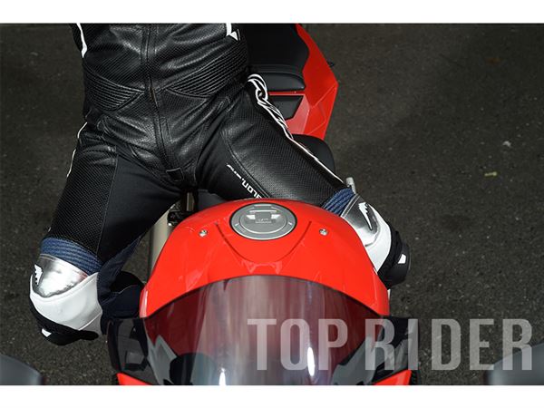 只使用外側腳,讓臀部朝內側斜後方移動,外側膝蓋靠著油箱邊緣,注意別讓負重和身體穩定度跑掉!