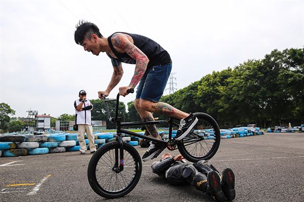 最近剛拿下特技腳踏車冠軍的FISH,今天也第一次飛越6人成功。