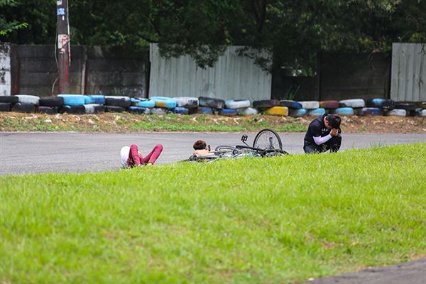 屬於趣味競賽的腳踏車組,竟發生嚴重追撞,三個選手在地上痛到起不來,以後腳踏車組也要穿全套裝備了。