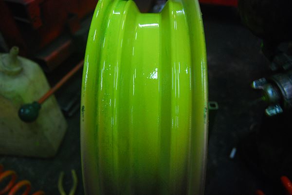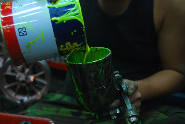 最後將輪框外表也噴上螢光漆料,等漆料乾的差不多了,在重複以上動作直到達到你要的光澤感及厚度就可以了