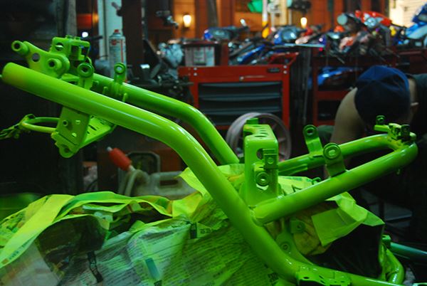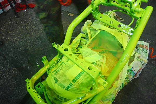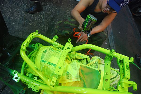 首先我們要先了解「噴漆」與「烤漆」的差異,簡單的來說「噴漆」有者價格便宜、施工容易的優點,但是噴出來的成品往往都會卡附灰塵,導致表面不光滑,色澤也不像「烤漆」那樣明顯,反觀「烤漆」雖然出來的成品顏色及光澤都具有一定水準,但缺點就是施工困難、價格偏高,並不適合玩家自己動手DIY。很多人會問,「烤漆」與「噴漆」的工法有哪些不同的地方,其實我們可以簡單的分類,「噴漆」是一種塗裝工法,而「烤漆」是一種要使用噴漆塗裝的工法,一般來說「噴漆」只需要噴上漆料等待乾燥後再上金油這兩道步驟,地點也不受限制,「烤漆」則需要五道步驟,分別為:拋光與拋鏽、鍍鋅補土 、塑膠補土、中塗底漆 、噴塗表層漆與金油 ,在噴上漆料的時候還需要熟練的技師及無塵工作室,確保表面不會有流鼻涕(同一地方漆噴太厚)與沾附灰塵(表面會有顆粒,不光滑)的情況發生。