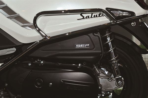 在配備方面, 動力核心搭載了SUZUKI自豪的SEP高效能引擎,通過六期排氣法規的Saluto兼顧環保與動力表現,同時更有1公升高達51.7公里的二級油耗水準,堪稱同級之最。雙槍後避震附有三段預載可調,可依車主喜好進行調整。制動部分採用前碟後鼓的配置,動靜之間都能安全煞停。讓騎士不僅沉浸在Saluto的優雅外觀,更有著優異的操控表現。儀表板採用液晶與指針混合的方式呈現,結合液晶螢幕的精準顯示與指針的經典情懷,與混搭主題不謀而合。值得一提的是常見於螢幕周圍的控制鈕因安全考量,將按鍵整合到右手把總成上,讓騎士毋須將手離開車把上去做調整,便利性增加不少。鑰匙部分採用與汽車同級的Keyless 系統,在車輛半徑1.5 公尺內都能感應啟動。同時坐墊採用自動彈起設計,不需繁瑣程序即可打開坐墊放置物品,對通勤族十分友善。此外, 為避免Keyless 鑰匙沒帶到而陷入無法發車的窘境,SUZUKI 十分貼心地設計密碼鎖,只要輸入專屬密碼也可以啟動車輛。全車導入LED 燈具,結合義式風情的方狀頭燈,經典與精緻的結合下更顯質感。全車系共有五種車色分別為:米蘭白、翡冷翠綠、托斯卡尼灰、威尼斯紅以及西西里黑,每種配色都能呈現獨特的風格。