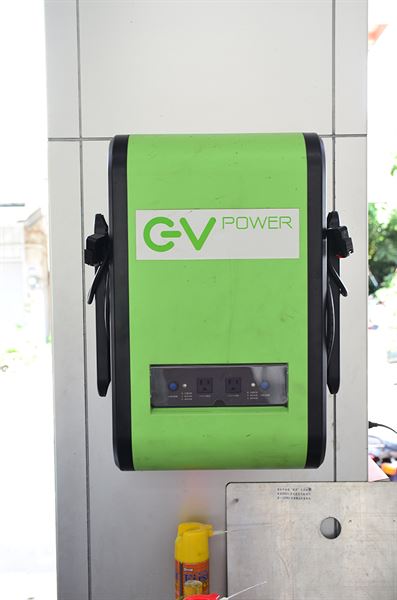 因應環保的概念,店內配有電動車充電設備供民眾充電