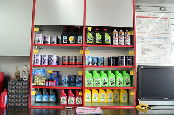 選擇多樣的原廠機油,擺放在架上供消費者選擇合適的機油