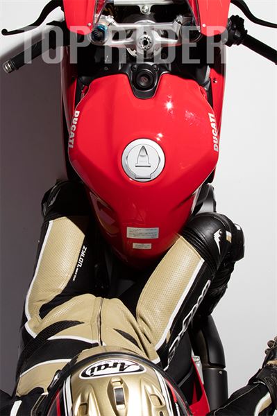 當向後就坐的時候,膝蓋頭的內側和油箱側面就不會產生空隙,然後以向前頂住的方式讓膝蓋緊貼油箱,就能維持身體姿勢,承受減速時的反作用力。