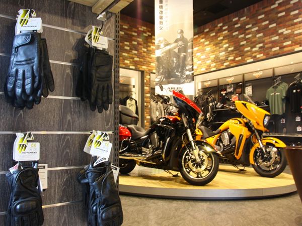 問世於1997年的VICTORY MOTORCYCLE雖是新興品牌,但車款線條洋溢肌肉力學,整體恣意奔放的造型更散發所謂新世代,跳脫傳統美式窠臼的復古美學,於是年輕有勁、活潑熱情也成為VICTORY展區的最大特色。為展現一致性特色與標準化規格,任何VICTORY展區內的所有元素包括裝潢架構、擺設鋪陳與用料結構,都需經過原廠認證核可,海德生當然也不例外!展區以兩部勝利重機為中心,加上三面環繞的展示櫃,搭配暗色鐵架與紅白磚塊的襯托,除了規劃出完善的瀏覽動線,寬敞無間隔又明亮的空間設計,更讓車迷視線能完整投射到每件包括:外套、T恤、車靴及手套等展示部品,增進購買入手的慾望。因品牌特性使然,VICTORY展示間陳列的人身部品也明顯偏向年輕化,不但配色鮮豔、造型活潑,同時更販售「美國重機教父」Arlen Ness出品,專屬VICTORY車種的改裝套件,而「Arlen Ness」也是海德生代理的品牌。陳列商品除是御用的正廠仕樣,款式更一應俱全,不論人或車應有盡有,絕對滿足每個VICTORY車主的多元需求。