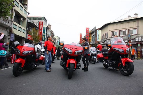 由HONDA旗下最新休旅車的三輛紅色的F6B帶隊,形成三排車陣浩浩蕩蕩的進入延平老街,並在事先申請管制下,將這將近兩百台的重車曬在西螺老街的柏油路上!而老街上的許多店家也熱情的贊助許多當地小點、青草茶、豆花等等,讓長途跋涉來到西螺的車友們馬上就體會到當地人的熱情!