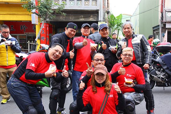 車友們接受當地店家熱情的招呼,開吃不忘擺Pose