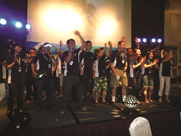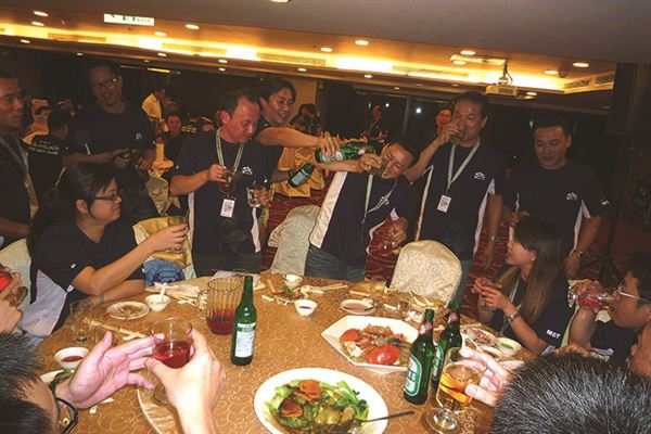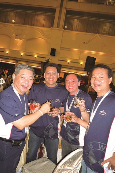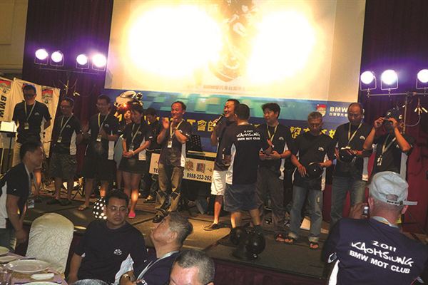 晚宴還穿插進行MOT新、舊任會長交接儀式,還邀請參加會師各車隊的領隊一起上台舉杯致意,而BMW北區車友聯誼活動也由劉福車業的劉理事長將會旗交接給花蓮車友舉辦,相約明年花蓮見!由榮譽顧問憲哥帶領的MOT歷任會長則到各桌向來訪車隊敬酒,酒酣耳熱之際,舞台上每年會師都得犧牲色相娛樂大家的諸葛總幹事又被剝光了,真是辛苦了。難怪憲哥會說:「會師真是給悶騷車友宣洩情緒的好活動,因為平日實在太緊繃啦!」卡拉OK的熱唱是一首接一首,車友輪番上台獻藝,就在威德車隊全體一曲「你是我的兄弟」的激昂大合唱後,晚會圓滿落幕。有的車友轉往客房續攤,精力旺盛的人攜家帶眷還去逛了高雄知名的瑞豐、六合夜市等景點,方才就寢。