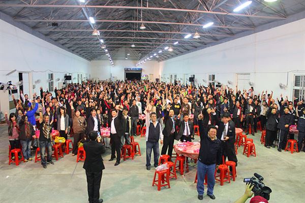 台東黃縣長(左二)與活動主辦人趙哥(右二)一起比出活動手勢