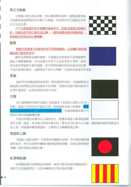 在賽道上呼嘯而過的車手們,聽力多半會被眾多比賽車的引擎聲給掩蓋掉,唯有透過雙眼注視來確認賽況,因此旗號的認識成為比賽前最重要的基礎常識。
