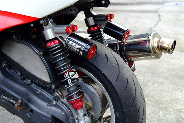 後懸吊系統使用自家出品的DY HIGH LOW後避震器,具備高低速可調整的特性。除了可適應高低速不同而自動改變阻尼的特性,快速調整的功能,更可因應各種不同的賽況變化。