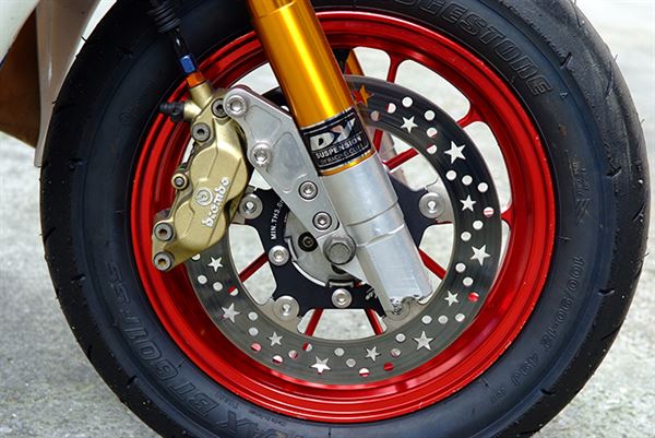 前叉使用了DY競賽型前叉,不但擁有相當高的質感設計,在穩定性及剛性都有不錯的表現。在經過幾次試車,其內部有所調整修改,目前這組前叉的表現已經相當穩定且狀況良好。