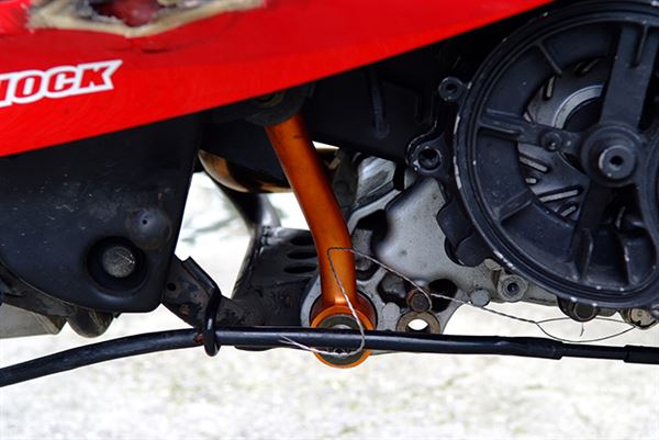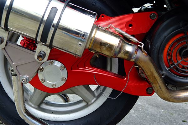 後搖臂改裝了銳澤鋁合金搖臂的改裝部品,讓整體後搖臂達到高剛性及輕量化的目標。同時避免排氣管萬一意外斷裂,還使用保安鋼絲將排氣管綁在鋁合金搖臂上,以保護車手的安全。