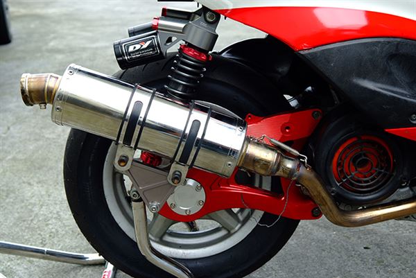 排氣管是銳澤依照DY劉老闆要求的設定所訂做而成。事實上排氣管有許多不同長度及口徑的版本,皆依照引擎設定及實際比賽的情況,選擇最適合的排氣管搭配出賽。