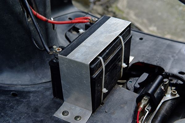 由於電盤不具充電的能力,因此需要額外的電力供應改裝電腦等其他電子配件,所以必須安裝獨立的電瓶。將電瓶安裝在車身的中心,也有助於重心的配置,可說是設想周到