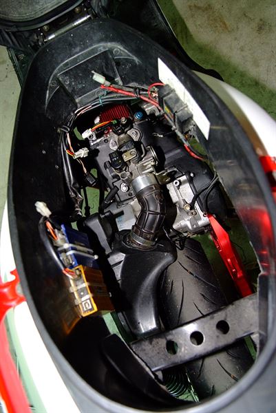打開坐墊後,引擎及線路配置的狀況便一覽無遺,如此一來不但方便維修、調整車輛,插孔朝上的可程式ECU,也更方便插線進行點火、供油改寫的工作。