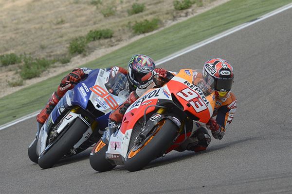 此站為西班牙境內的Aragon站,想必又是一場被西班牙人獨霸的比賽了。比賽一開始依然是Lorenzo運用超群的起跑技術衝到領先的位置,緊接著的是竿位出發的Márquez維持第二,再來是同車隊的Pedrosa,第四位則是Rossi。經過幾圈之後,Rossi漸漸抓不到第一集團的速度與身後的Brandl、Bautista、Crutchlow形成第二集團。而這時,Pedrosa很順利的超越了Márquez來到第二,讓這兩位『Repsol Honda』的車手展開了零距離的戰鬥。